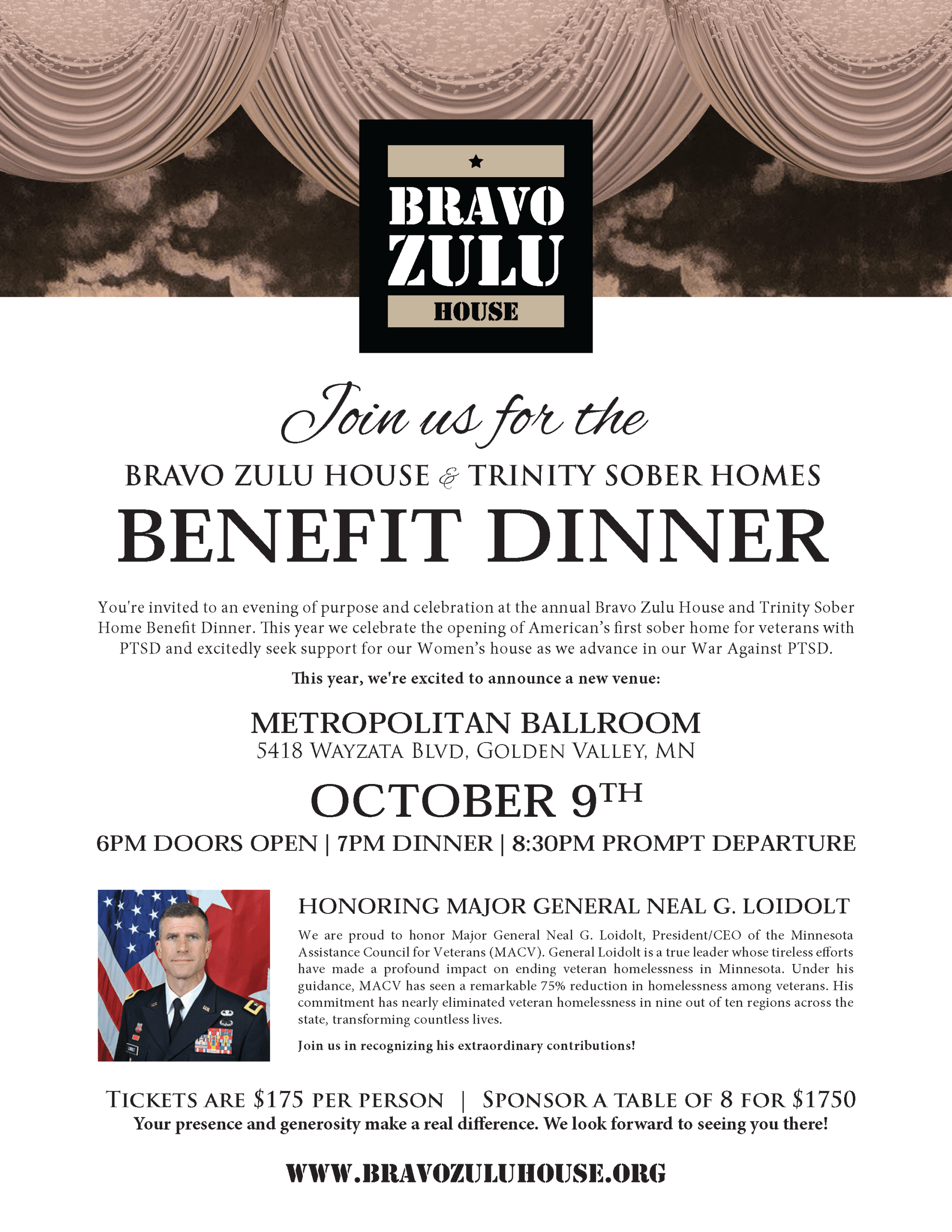 Trinity Sober Homes & Bravo Zulu House cordially invites you to an evening of purpose and celebration. This year we celebrate the opening of America’s first sober home for veterans with PTSD and seek support for our Women’s House.